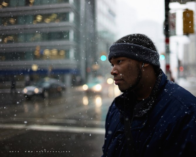 It’s great when all it takes is a nod and the expression is so natural. This is a very nice image with excellent separation of the subject and the snow flakes in the focal plane.