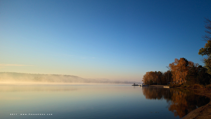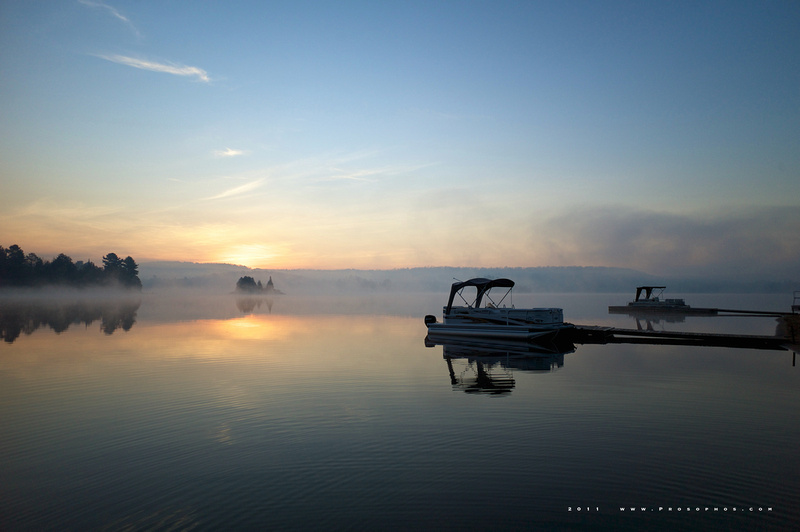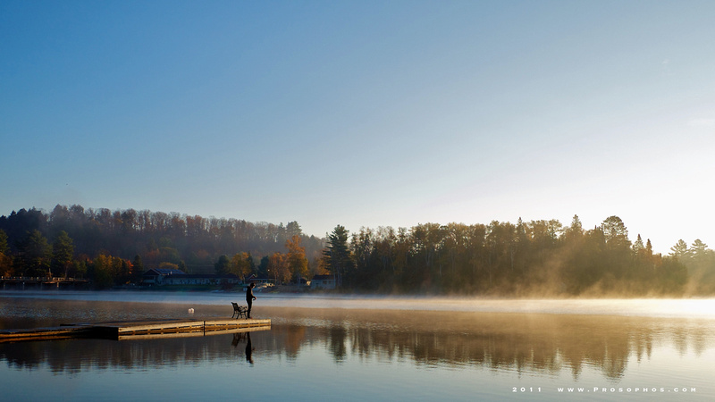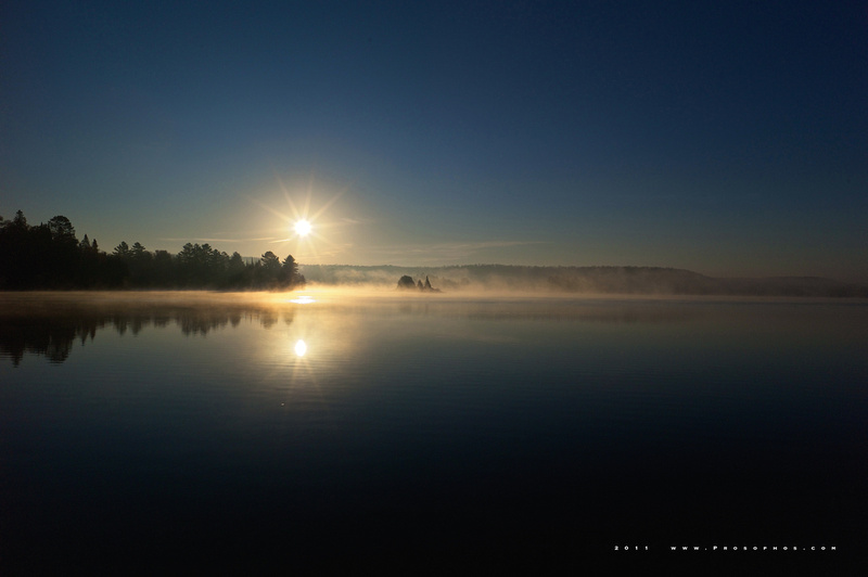 The sun appears and burns the fog off the surface of Oxtongue Lake.